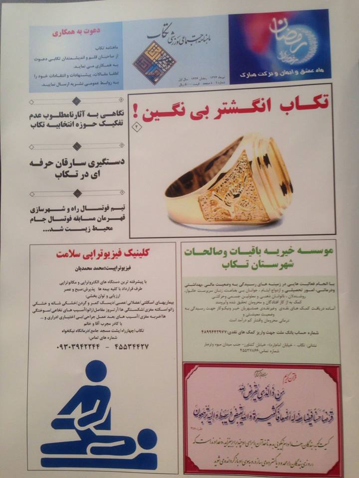 تكاب: ماهنامه تكاب قصد دارد اخبار مربوط به تكاب درماهاي گذشته كه در رسانه ها و سايت منتشر شده است را به صورت گزيده بازنشر دهد اخبار زير مربوط به نيمه دوم ارديبهشت ماه تا پايان خرداد 94 مي باشد