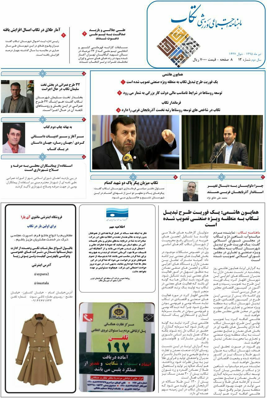 پایگاه خبری – تحلیلی تخت نیوز:جلسه ایی عصر روز پنجشنبه مورخه ۹۵/۴/۲۴ با حضور جناب دکتر همایون هاشمی نماینده محترم مردم تکاب،شاهیندژ ، میاندوآب در مجلس شورای اسلامی ، اعضای شورای اسلامی شهر و شهردار ،کارشناسان و مسئولین در خصوص حل مشکلات و معضلات شهر و شهرداری تکاب برگزار گردید.