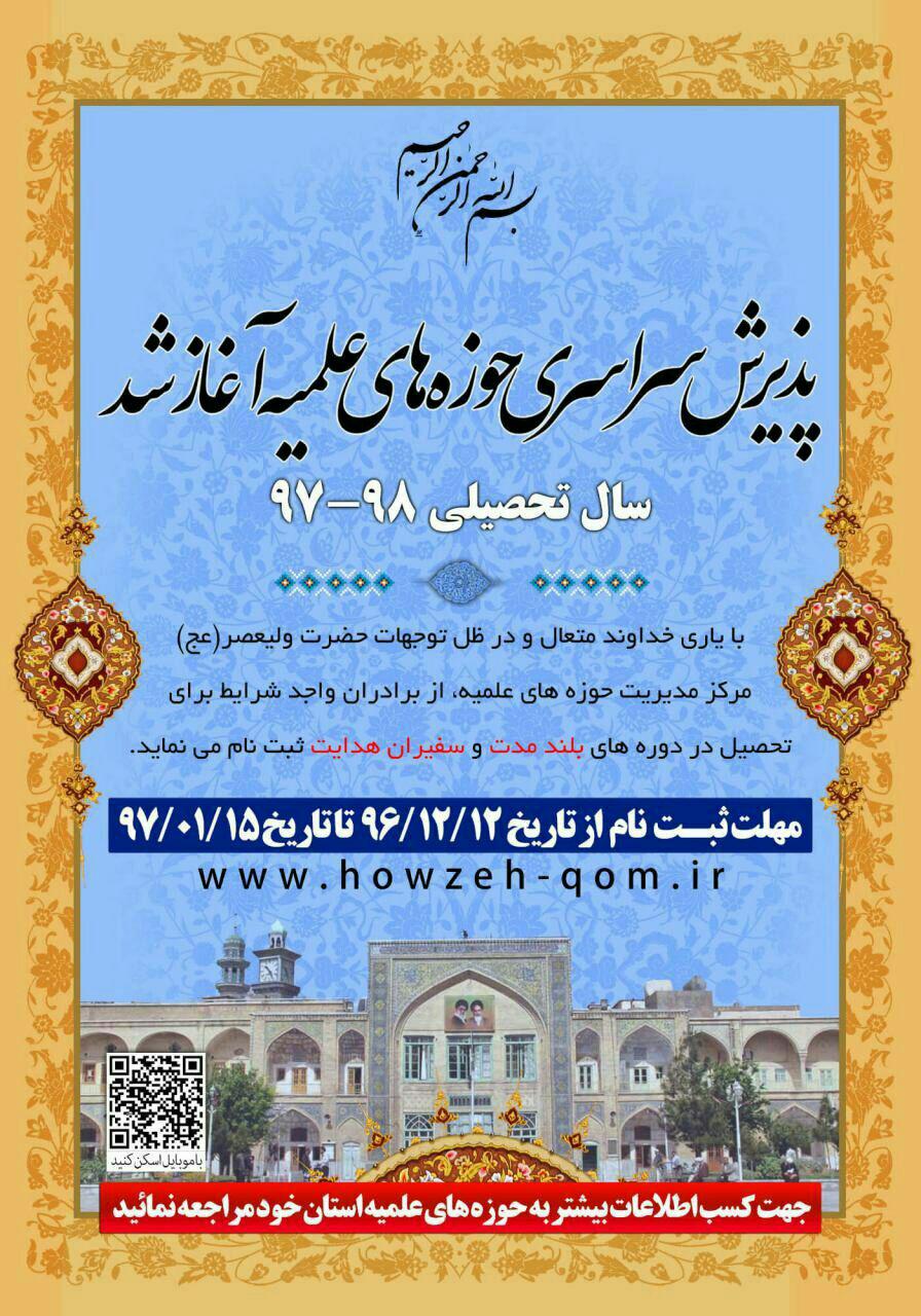 🔹جهت کسب اطلاعات بیشتر به حوزه علمیه واقع در خیابان نماز مراجعه نمایید.