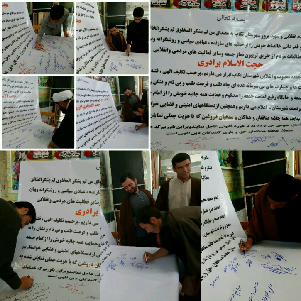 برپایه این گزارش، در نماز جمعه امروز تکاب مردم در حمایت از امام جمعه این شهرستان طوماری را امضا کردند.