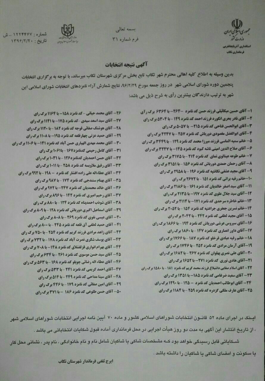 به گزارش خبرنگار مهر، بر اساس اعلام ستاد انتخابات شهرستان تکاب نتایج انتخابات شورای شهر به تفکیک آرا به شرح زیر است: